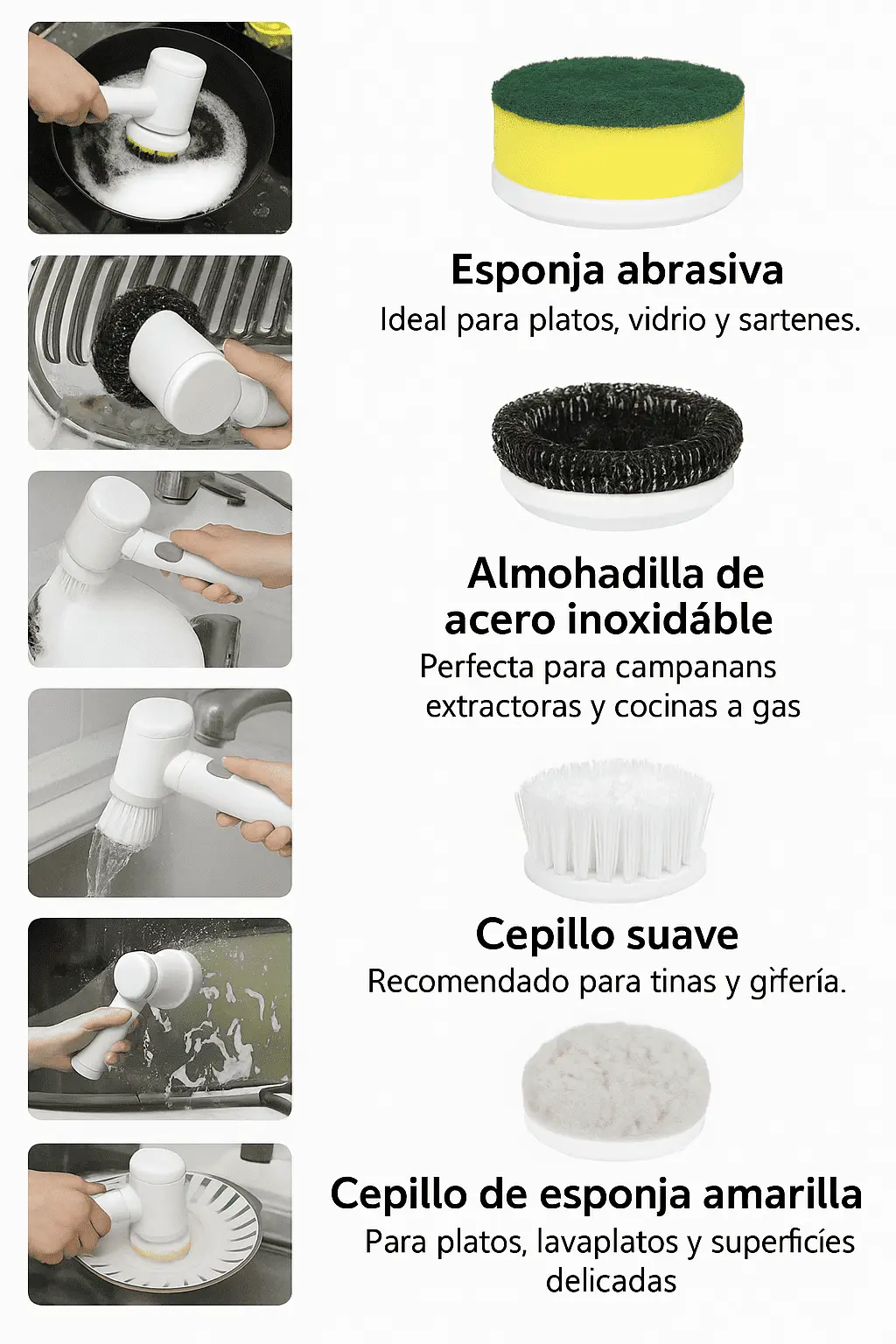 Incluye el cepillo eléctrico recargable y 5 cabezales intercambiables: esponja abrasiva, almohadilla de acero, cepillo suave, cepillo de esponja amarilla y funda de lana sintética.